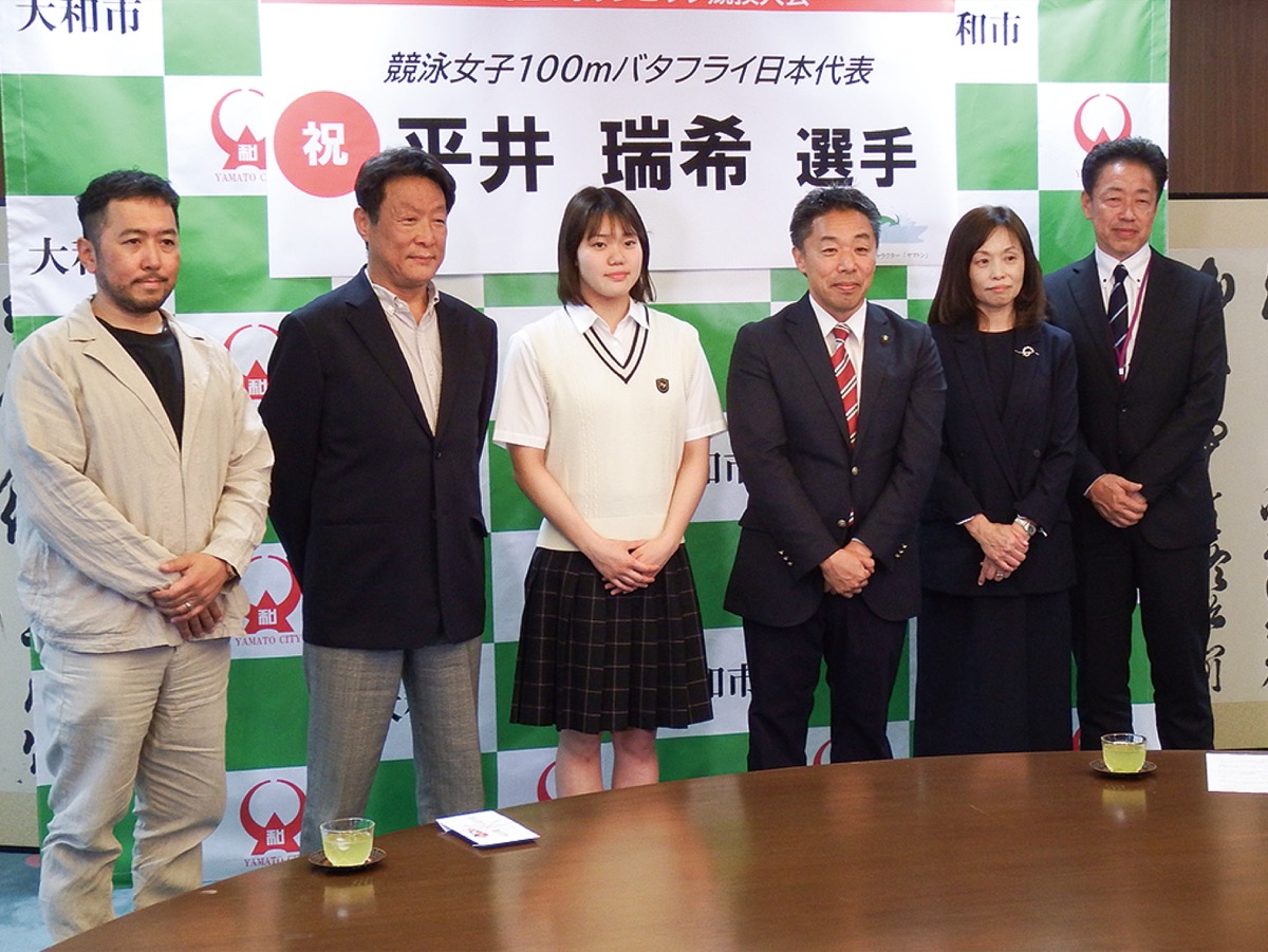 つきみ野在住の平井瑞希選手(日大藤沢高校3年)が今年7〜8月に開催されるパリ五輪の競泳女子100mバタフライ日本代表に内定したことを受け、5月16日に大和市役所で古谷田力市長を表敬訪問した。目標については「メダル獲得」と明かした。