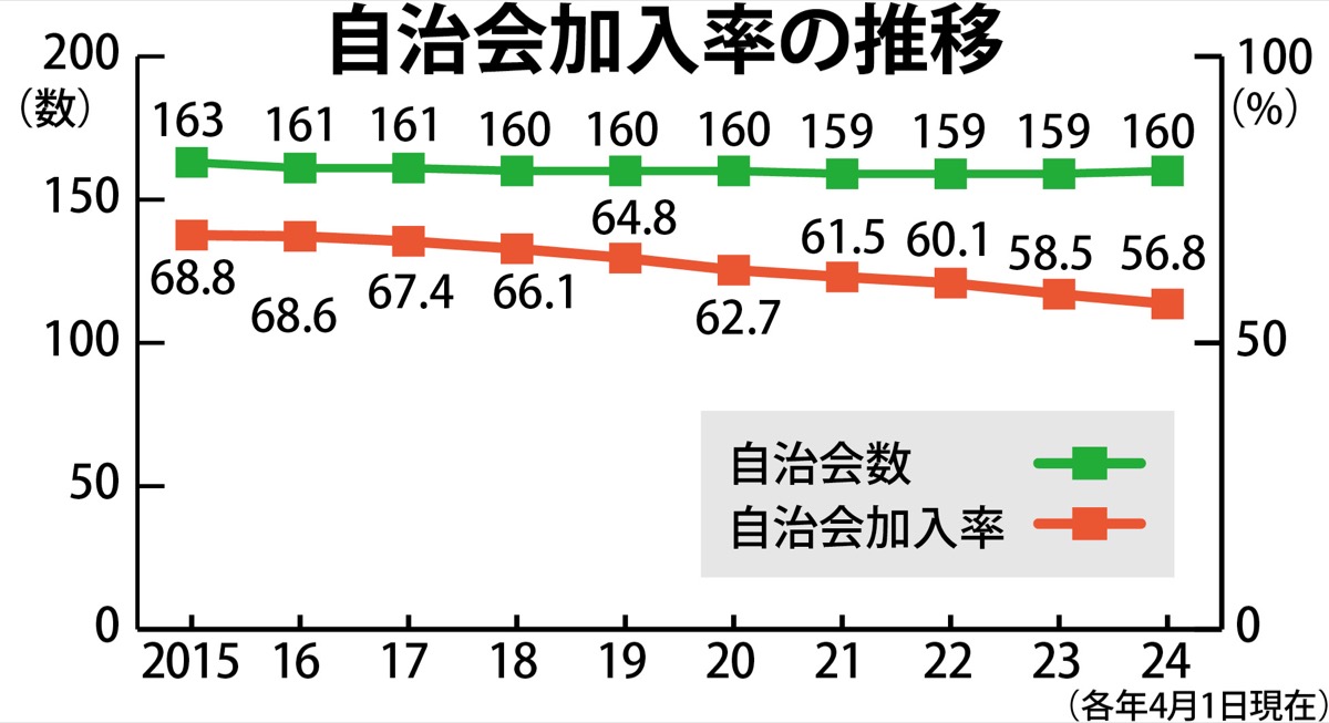 自治連によると、市内には現在160の自治会があり、過去10年で大きな増減は見られない。一方で加入率は2015年4月1日時点が68・8%なのに対し、24年同時期は56・8%。大山会長は加入率低下の理由を「若者世代の減少と地域住民の高齢化」と分析し、「あと10年経てば、50%を下回る恐れもある」と危機感をつのらせる。