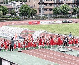 試合前にはモミヤマ幼稚園の園児による「鼓笛隊」の演奏や道を作って選手を激励する姿も見られ、大和シルフィードの橋本紀代子代表取締役社長(=「人物風土記」で紹介)は「来場者1千人を目指して、今後もさまざまな企画に取り組みたい」と話している。