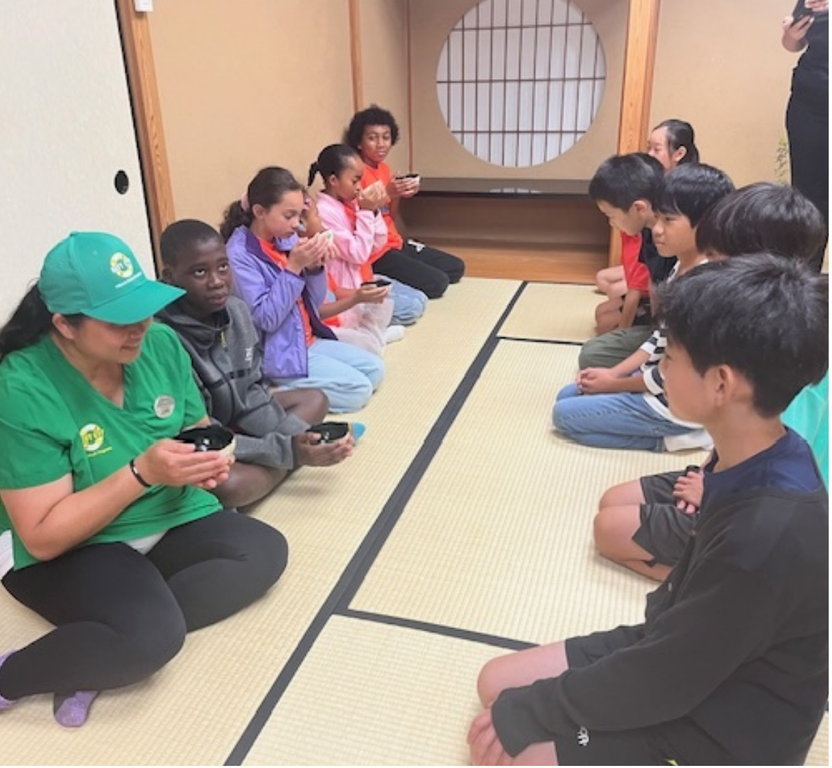 両校の児童らは茶室を見学し作法を学んだ後、ていねいに点てた抹茶を互いにもてなした。その後は交流の場として、英語で書かれたメッセージカードの交換なども行われた。