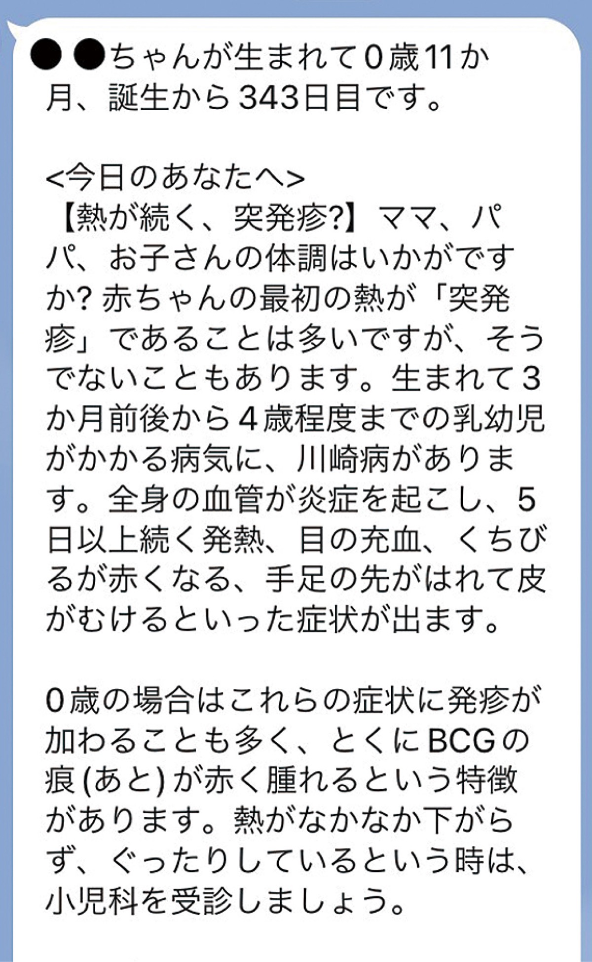 内容は、妊娠中から出産、出生から100日目、101日目から1歳の誕生日前日までといった、子どもの成長に合わせた生活のアドバイスなどを配信している。5月末時点で768人が登録している。