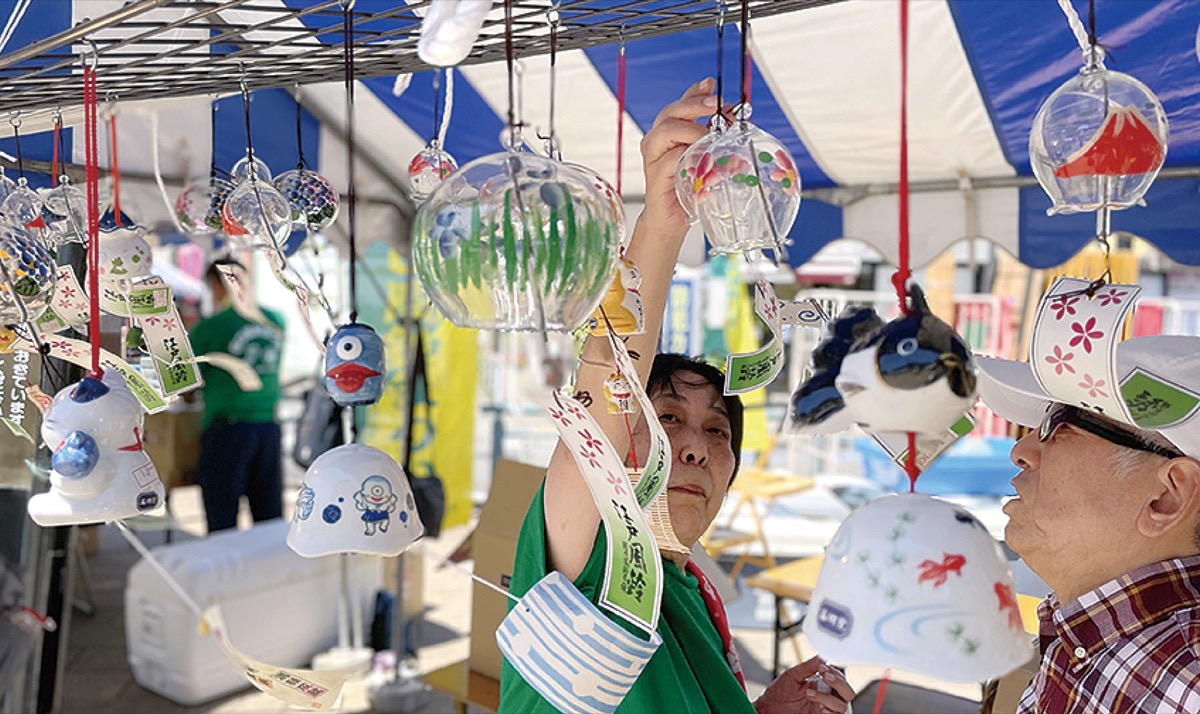 正午からはガラス細工で色彩が美しい江戸風鈴(東京)、高く澄んだ音が特徴の南部風鈴(岩手)、瀬戸物で出来た瀬戸風鈴(愛知)、南部風鈴を涼しげな竹千筋で囲んだみやび(静岡)、鋳物の表面を虫が食いつぶしたような模様が特徴の松笠風鈴(宮城)、釣りしのぶなどの販売も行われる。