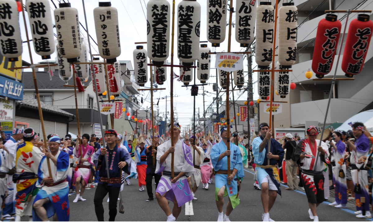 28日午後4時5分、各連の選抜メンバーがそろい、鳴り物にあわせて踊りが始まると、声援と手拍子が起こった。30度を超える猛暑の中だったが、踊り手たちは笑顔を絶やさず、大勢の観客たちを楽しませた。