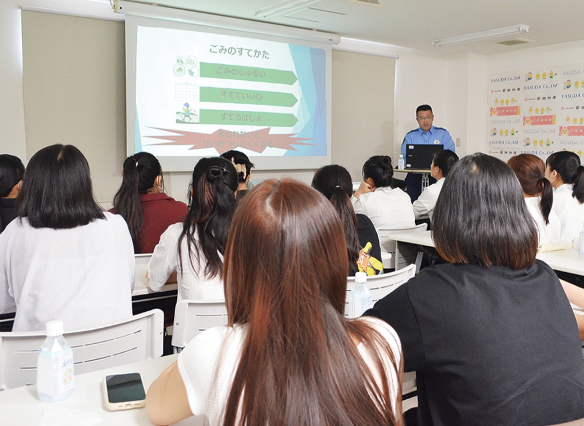 給食事業などを展開する株式会社安田物産(安田幹仁代表取締役社長/深見西)は8月22日、同社に勤める外国人従業員を対象にした防犯・交通安全講習を実施した。同社で初めてとなる講習に参加した約40人は真剣な表情で耳を傾けた。