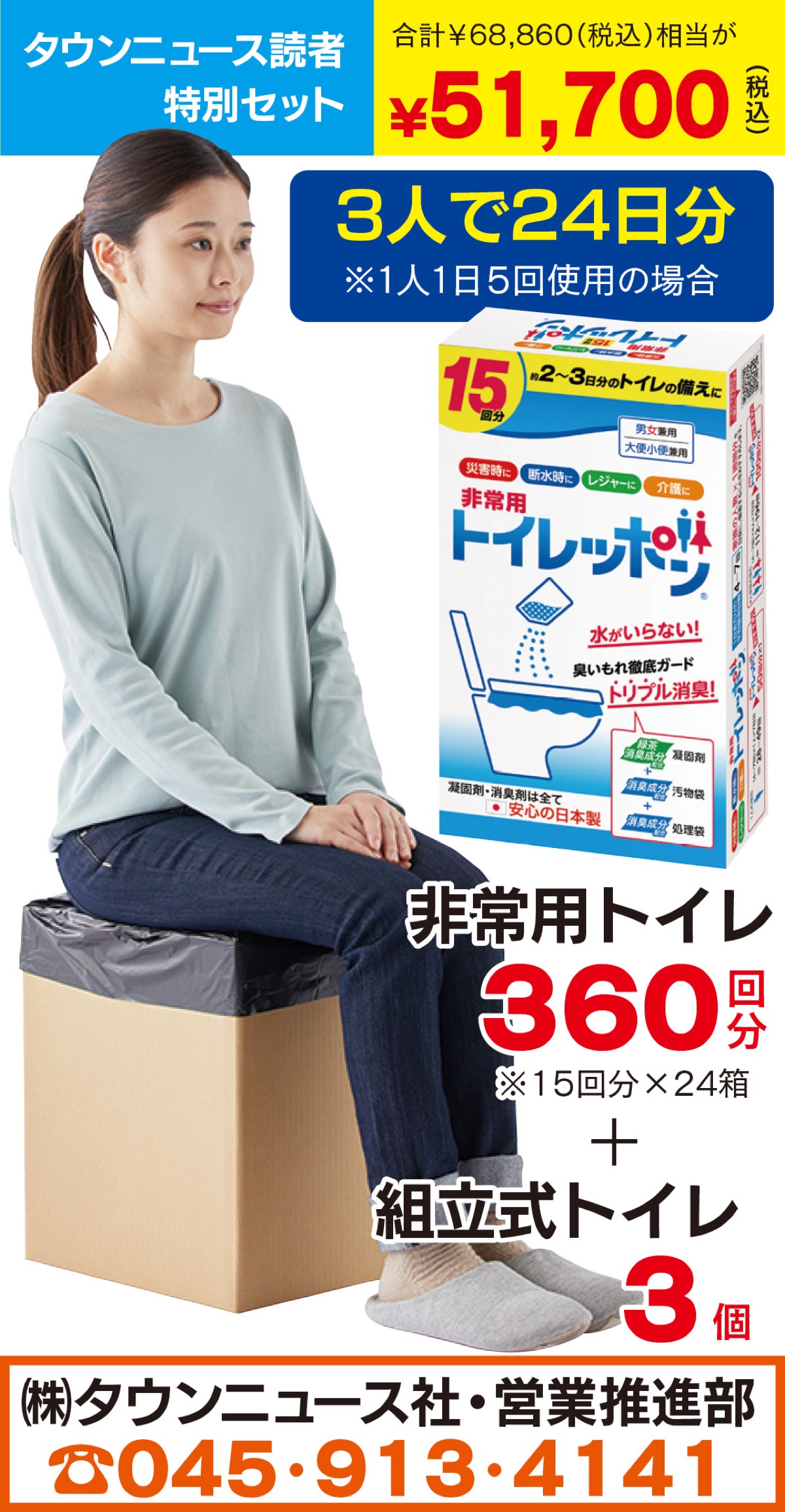 タウンニュース社では「非常用トイレセット」を取り扱っている。たたんで収納し組み立て簡単、耐荷重500kgの段ボールトイレと、防臭袋・凝固剤がセットに。360回分・トイレ3個セットを、読者特別価格税込5万1700円。問い合わせは左記へ。
