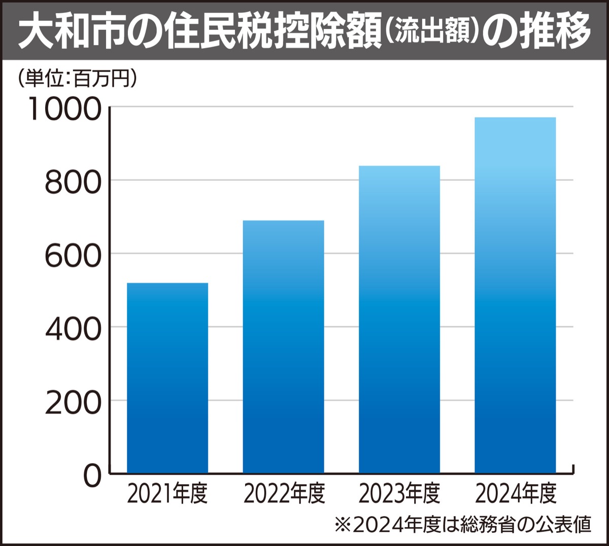 大和市民が「ふるさと納税」の制度を活用して他の自治体に寄附したことによる住民税の控除額(流出額)が、2024年度は9億7048万円(公表値)だったことが分かった。総務省がこのほど公表した同制度に関する現況調査結果によるもので、流出額は県内の全33自治体で増加。大和市は前年度比1・3億円増で過去最多を更新した。