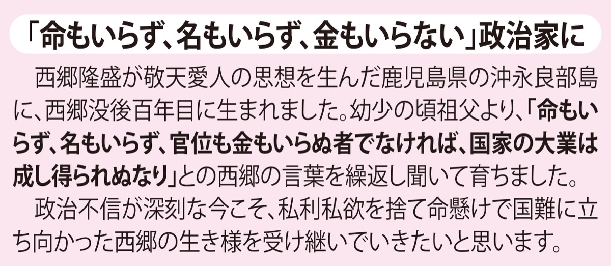 地域に寄り添い、とことんこつこつ8年半。地元の声を力に、国会の最前線で闘ってきた経験を活かす時だと考えています。そして「世界に誇れる日本」をつくってまいりたいと思っています。