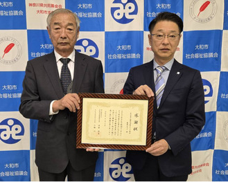 一般社団法人神奈川県トラック協会県央ブロック(金谷智司ブロック長)が6日、大和市社会福祉協議会(石井敏英会長)へ5万円を寄付した。当日は同協会の新村千成理事が保健福祉センターを訪れ、市社協から感謝状が贈られた。