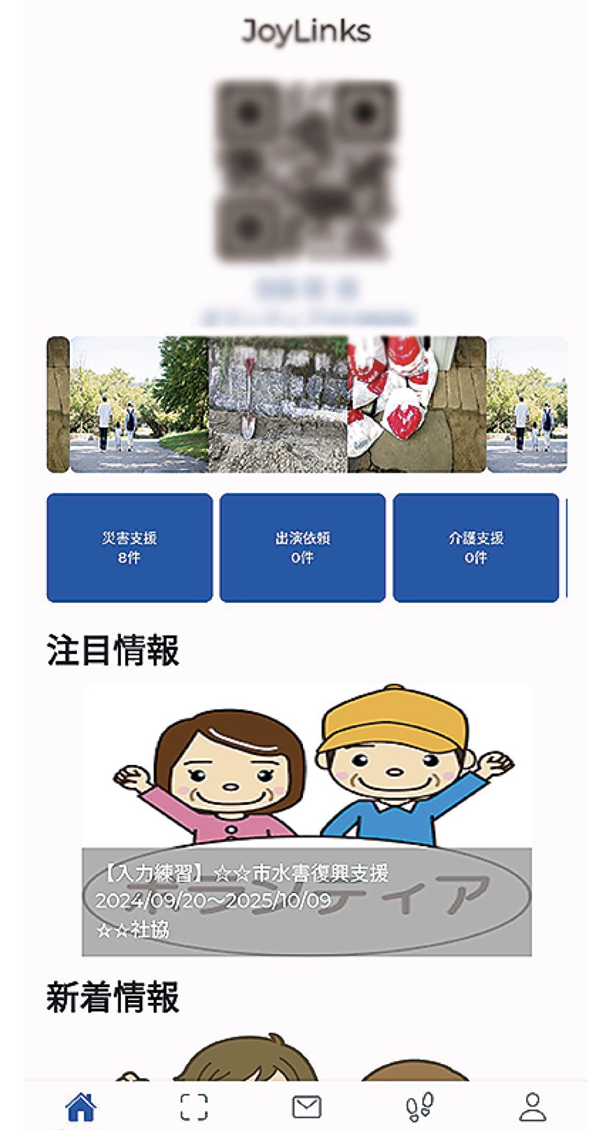 今回導入された「JoyLinks」は、スマートフォンにアプリをダウンロードし、ボランティアの受け付けや支援要請、資機材の貸出返却などを二次元コードで一括管理できるシステム。