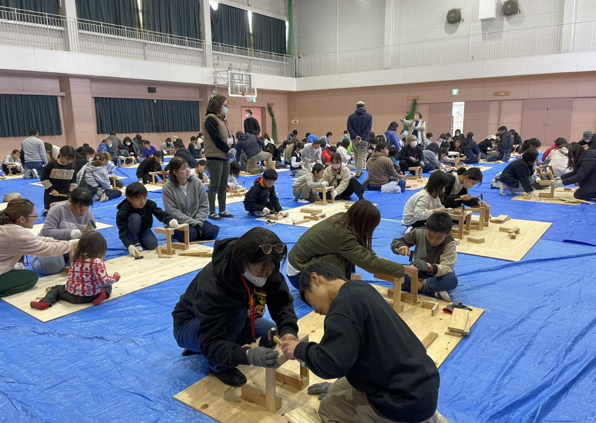 ブルーシートが敷かれた体育館には、同組合が用意したスギの木材やトンカチが置かれ、児童らは組合のメンバーやサポートとして参加した「大和リバティライオンズクラブ」の会員らに見守られながら作業を進めていった。