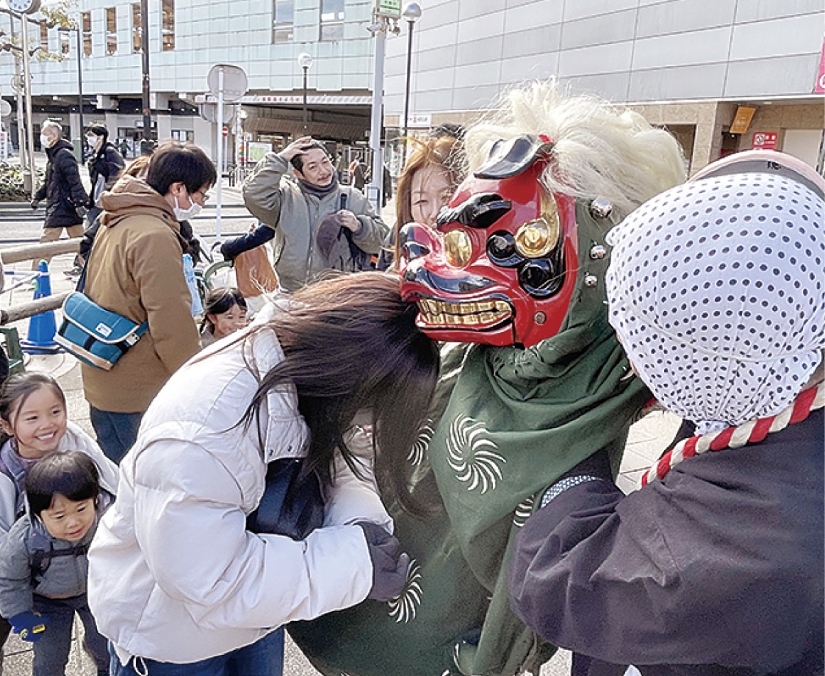 プロス前のステージでは、地元の宮下太鼓連による獅子舞なども披露された。集まった人たちは、厄除けのため獅子舞に頭をかんでもらった。