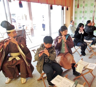 大和天満宮(平賀あずさ宮司)で1月12日、雅楽の奉納演奏が行われた。「学問の神様」とされる菅原道真公が祀られる社殿で小学生2人、大学生1人、専門学生1人の計4人が学業成就と雅楽上達を祈念しながら演奏を披露した。