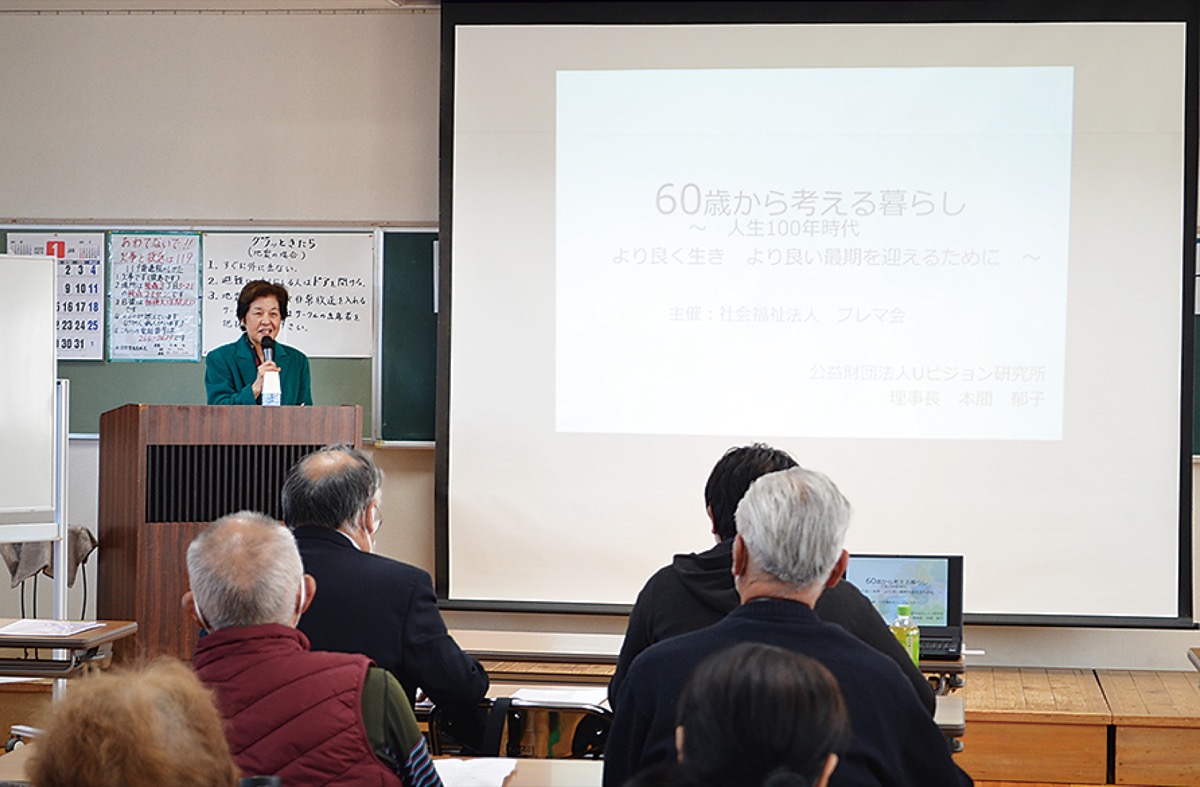 社会福祉法人プレマ会(古谷田紀夫理事長)は1月31日、コミュニティセンター桜森会館で初となる市民向けセミナーを開催した=写真。地域住民や福祉関係者など約50人が参加した。「60歳から考える暮らし」をテーマに、老後の人生をより良く生きるコツを学んでいた。