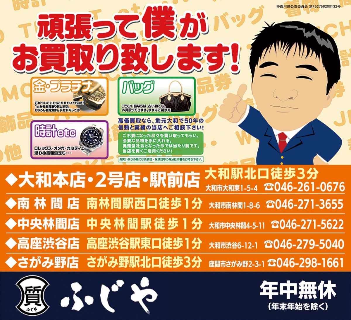大和市を中心に7店舗を展開し、質屋・古物商として半世紀以上の歴史を誇る「有限会社ふじや商店」(藤岡博代表)。