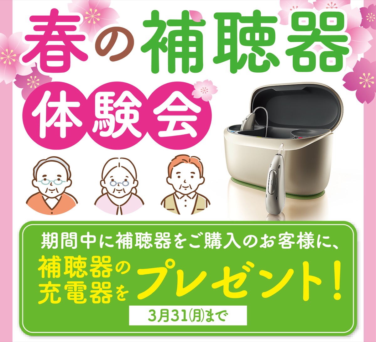 キャンペーン期間中の購入者には、補聴器の充電器をプレゼント。
