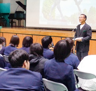 大和中学校(高井文子校長)の体育館で5日、将来を担う生徒たちを応援するために企画された「大和中の輝く未来を語る会」と題する講演会が開かれ、同校の17期卒業生で、鍛金彫刻家として活躍する安藤泉さん(75=「人物風土記」で紹介)が登壇した。