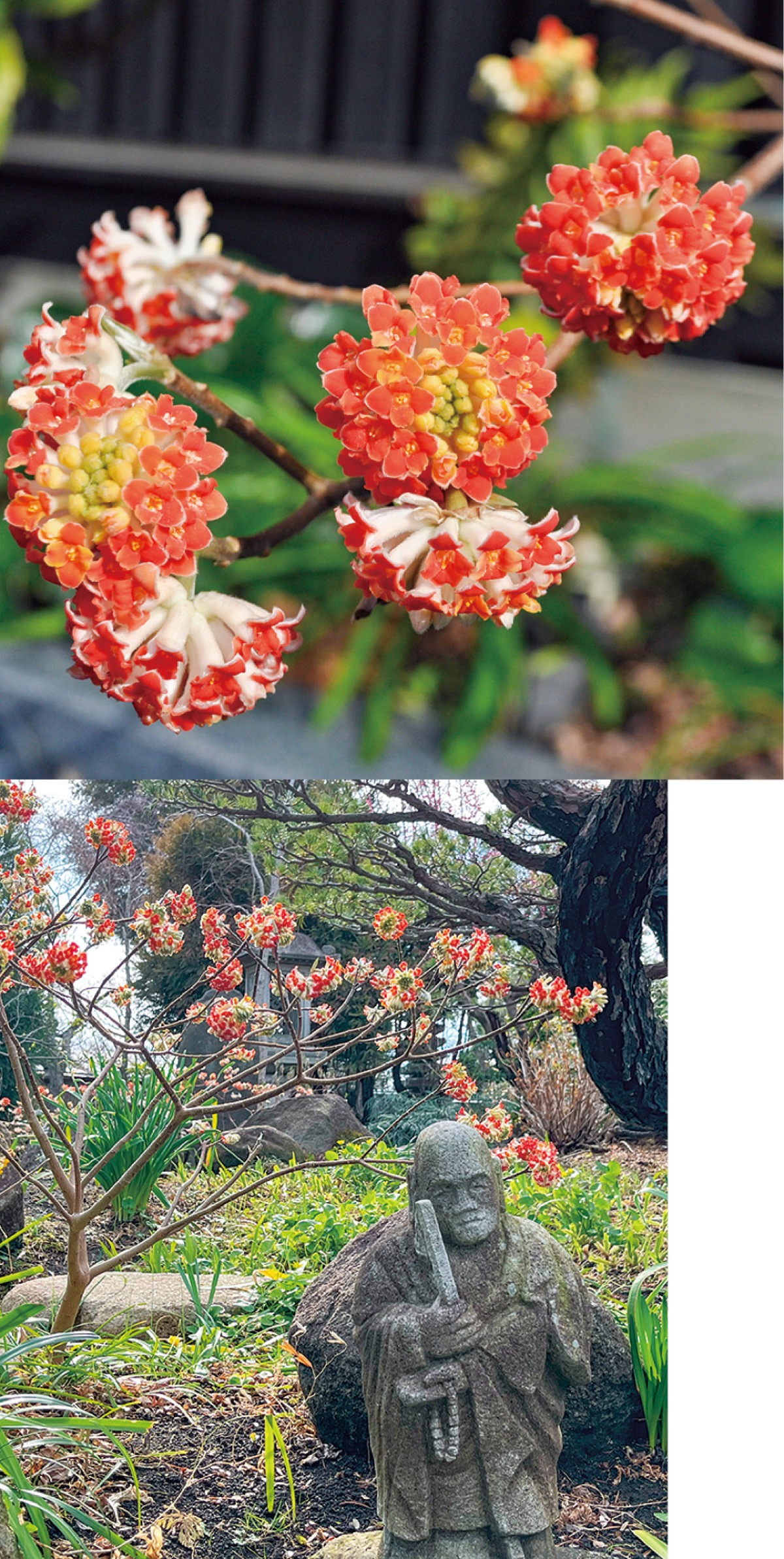 花のお寺常泉寺(青蔭文雄住職)では赤色の三椏が見ごろを迎え、参拝者を楽しませている。