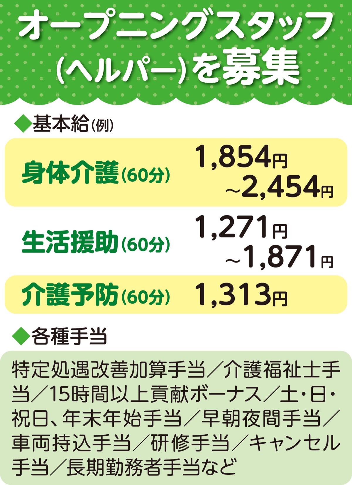 現在、新規オープンにあたり、オープニングスタッフとして働くヘルパーを募集している(募集条件などの詳細は別表を参照)。