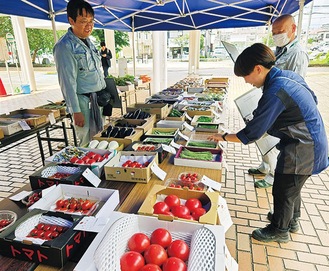 市内の農家が夏野菜の出来栄えを競う「夏野菜持寄品評会」が6月27日、市役所前の「だれでも広場」で行われた。