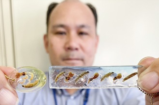 さらに、学校給食で提供されたちりめんじゃこに混ざっていたカタクチイワシ以外の小さな生物を活用した「レジンキーホルダー」(=写真)作りもあり、作品は持ち帰ることができる。