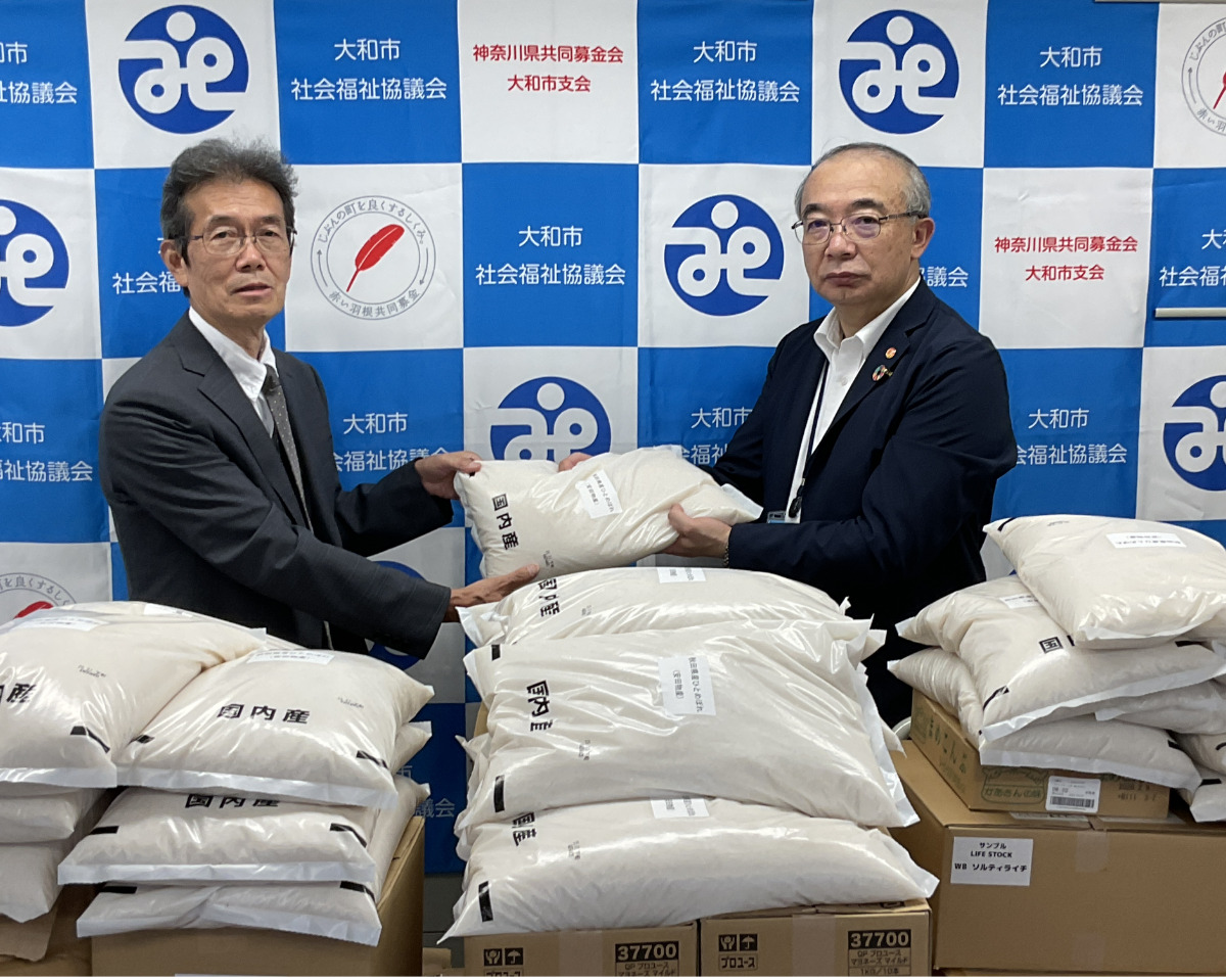 大和市深見西に本社を構える株式会社安田物産(安田幹仁代表取締役社長)が7月28日、米や飲料、調味料など合わせて515kgを市社会福祉協議会(濱田和博会長)に寄贈した。