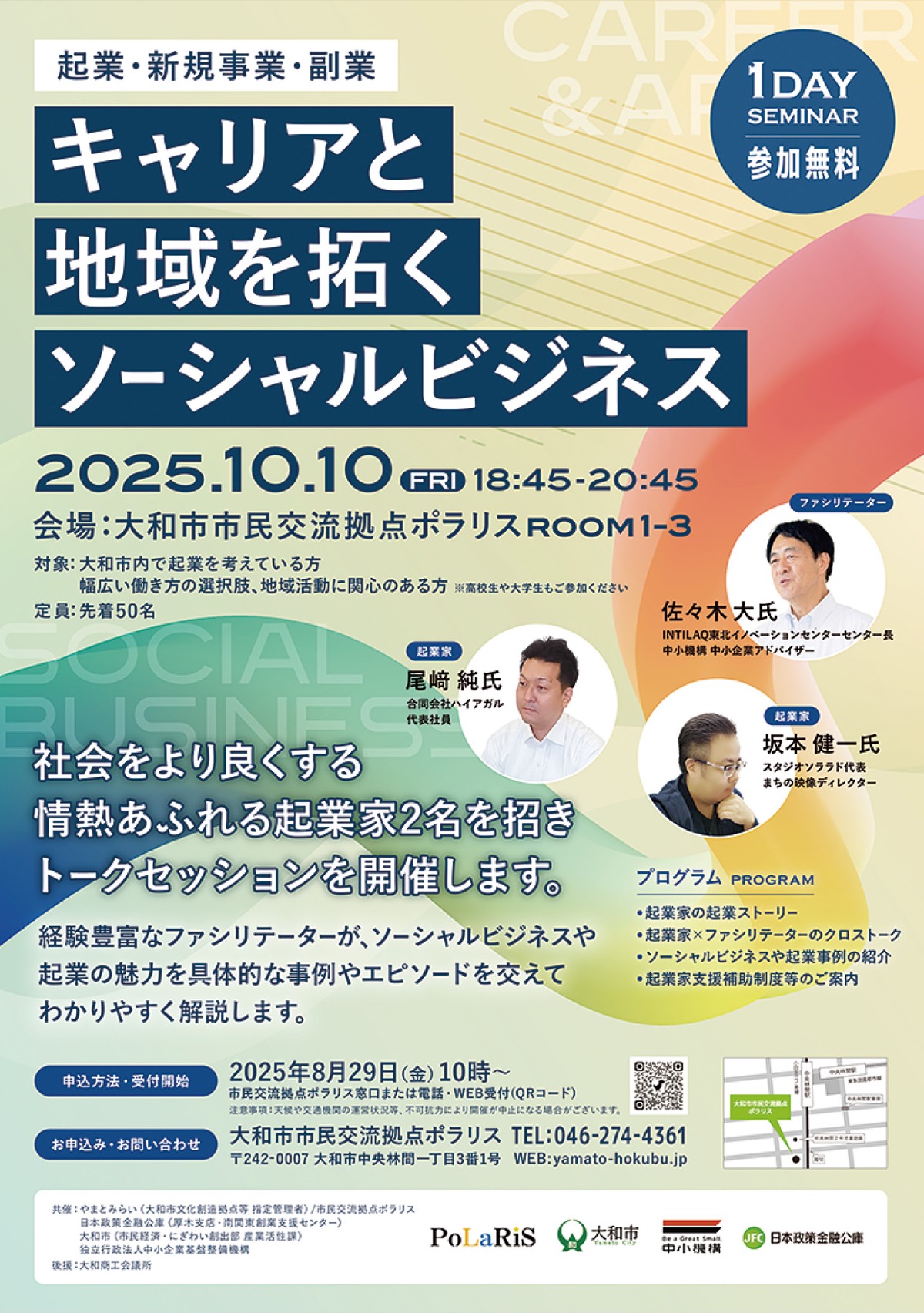 ビジネスセミナー「キャリアと地域を拓くソーシャルビジネス」が10月10日(金)、ポラリスで開催される。午後6時45分〜8時45分。