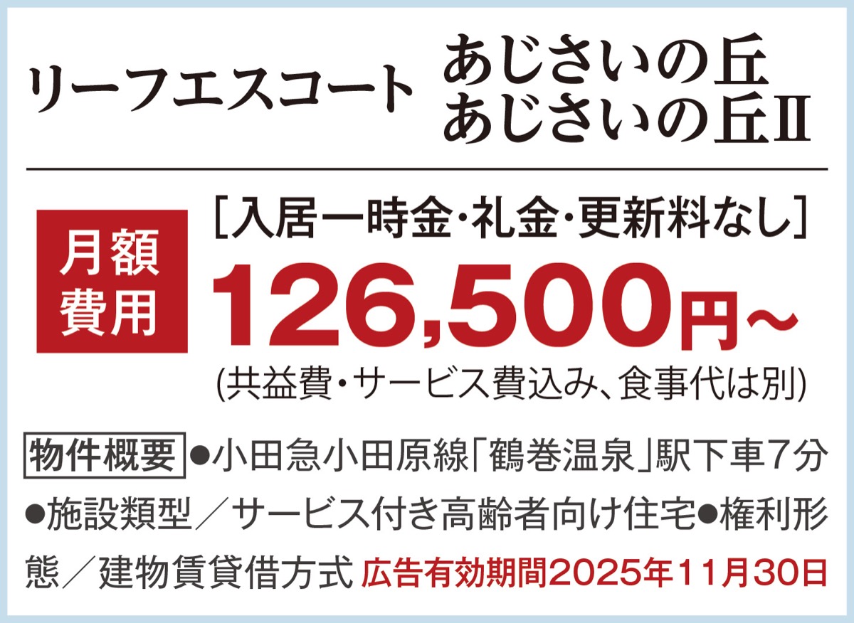 サービス付き高齢者向け住宅「リーフエスコートあじさいの丘」は、相鉄線「大和駅」から約30分の鶴巻温泉駅に位置。駅からは徒歩7分、丹沢の豊かな自然を身近に感じられる好立地にある。