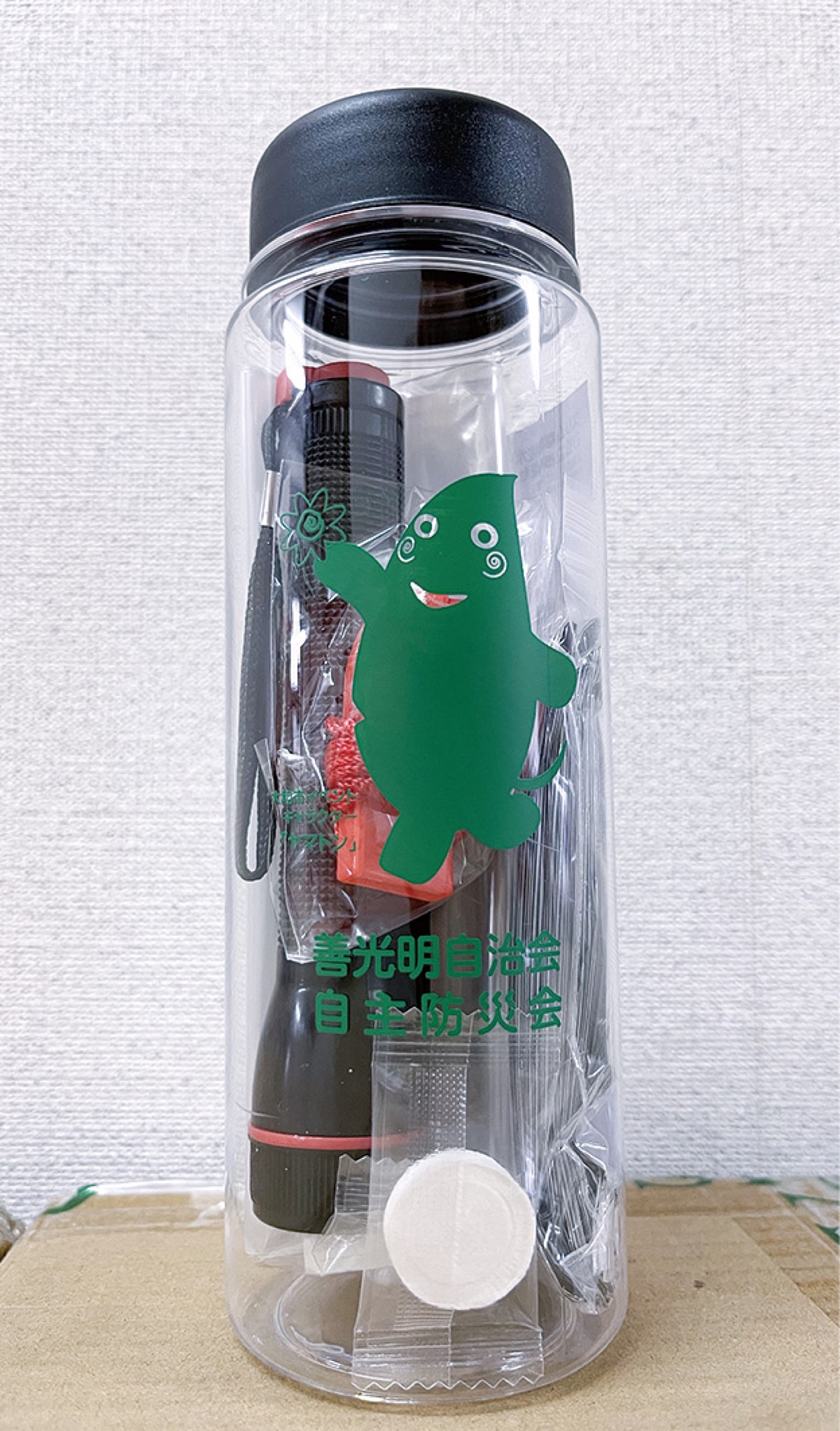 善光明自治会自主防災会(保田完次会長)がこのほど、同自治会に加入している約750世帯を対象に「防災ボトル」を配布した。