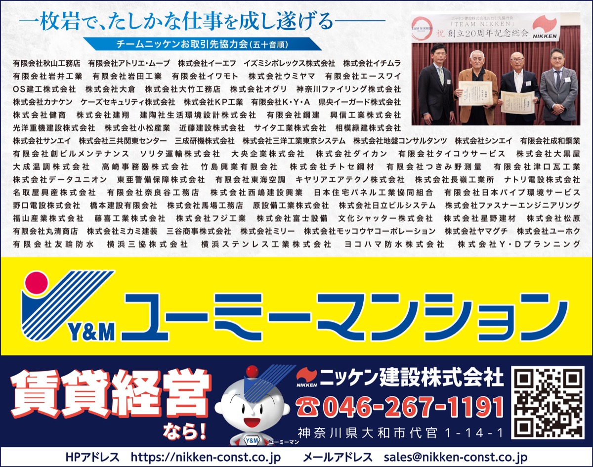 ニッケン建設株式会社(横澤高太郎代表取締役/本社・大和市代官)は、地元・大和市を代表する総合建設企業の一つだ。同社は2025年に創業75周年を迎え、ビル・マンション、商業・教育福祉施設、公共施設などの新築・改修工事に加え、土地活用提案、設計、施工、運用管理などを手がけてきた。新たな一年も建物を通して、お客様の未来と夢の具体化に努める。
