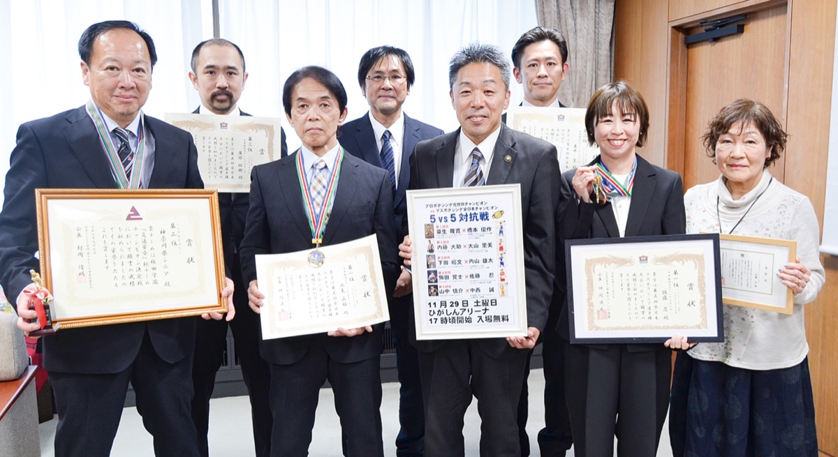 【功労表彰】新川久美子(弓道協会)、石川均(ラグビーフットボール協会)、鈴木浩之(野球連盟)、青木正始(バレーボール協会)、武田絵麻(同)、荻原俊昭(剣道連盟)、郷野厚郎(同)、高松好子(ソフトボール協会)、佐藤美雪(サッカー協会)。