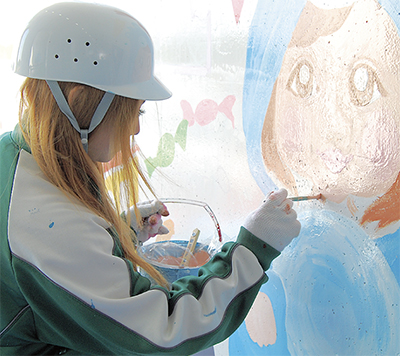 市から要請を受け、5人の生徒が先頭を切って先月1日から壁画制作に着手した。受験を終えた3年生らが活動に参加し、現在は約15人が筆を手に大作に挑んでいる。