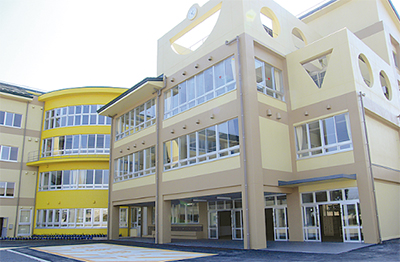 新校舎は太陽光発電システムの搭載や、雨水を利用した散水、壁全体が花壇のように草花を植えられる壁面緑化など省資源・省力化といった環境に配慮した建築になっている。