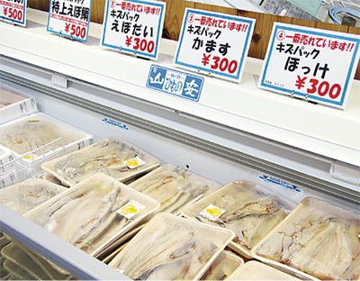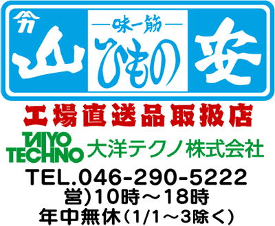 厚木市温水の大洋テクノ(株)は、小田原で江戸時代(文久三年)からひもの一筋、味の老舗『山安のひもの』を工場直送で販売している会社。直売所にはアジやホッケ、サンマ、エボダイ、キンメダイをはじめとするひものがズラリ。バラ売りは100円〜、訳あり品のキズパックは300円〜と、毎日驚きの価格で店頭に並ぶ。さらに、そば・うどんなどの乾麺や梅干、塩辛なども超特価で提供。ひものは冷凍で保存食にもなることから、まとめ買いをして被災地などへ発送する人も後を絶たないという。