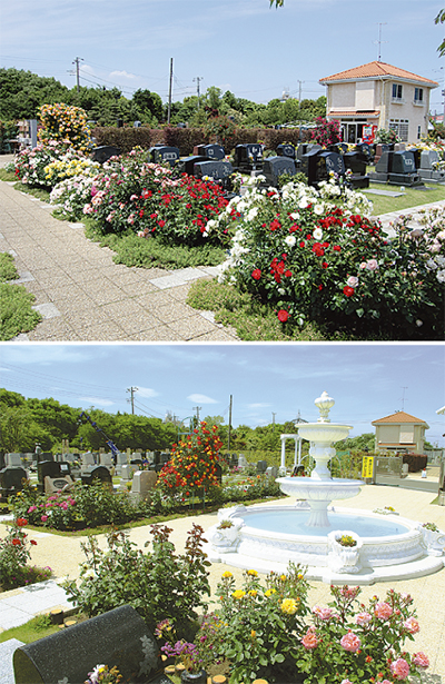 平成15年にバラの花咲く本格的なガーデニング公園墓地として開園。平成21年には第二期墓地区画も新たに完成。日当りがよく明るい雰囲気の中で、バラを始め四季を通じてたくさんの花や植栽がお参りする人を優しく癒してくれると大好評。園内には、0.8平方メートルから4.6平方メートルまで様々なタイプの墓所があり、いろんなデザインのお墓が建っている。全区画平坦で通路幅も広く、平面の大型駐車場を完備し、ゆったりと快適なお墓参りが出来る。今週から今月末までが最も見頃。ぜひ見学してみては。