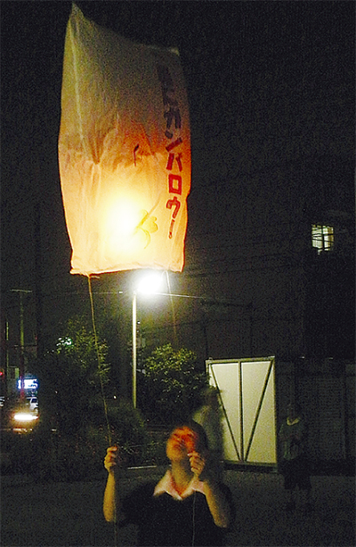 この日は地域の親子ら30人ほどが参加。絵や被災地へのメッセージなどを描いた灯篭内に火が灯されると、空気が膨張し、熱気球のように夜空に上昇。河原口の夜空に幻想的な光景が広がった。