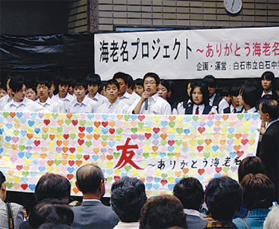 この日訪れたのは、同校の3年生113人で、震災支援の恩返しをしたいという想いから生徒たちが企画した「海老名プロジェクト〜ありがとう海老名」と題した催しが行われ、海老名市民およそ400人が歓迎した。