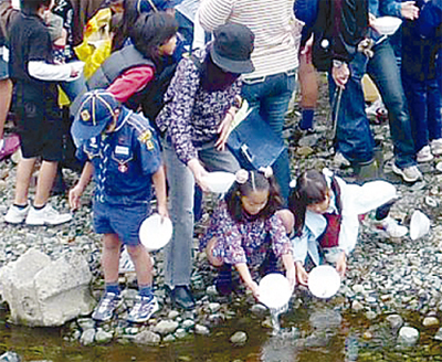 この日は同会会員や地域住民ら130人が参加し、昔から生息しているウグイやメダカなど約2000匹を川へ放した。水質汚染により川に魚が減ってきたため、10年前からこの活動を行っている。関係者は「これからの子どもたちのために川をきれいにしていきたい」と話していた。