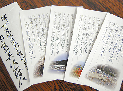 大谷南の写真スタジオ「オヤマ写真」に南三陸町の佐藤仁町長から直筆の手紙が届いた=写真。同店は震災直後に「何かできることはないか」と考え、募金箱を設置。店舗の一部で駄菓子を販売しているため、子どもたちが駄菓子のおつりを募金していた。昨年8月にも義援金を送り、手紙が届いている。