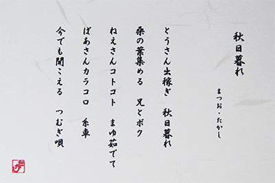 風邪による高熱が原因で5歳の時に両耳の聴力を失った松尾喬之さん(上郷在住・70)が、五行という制限の中で自身の思いを表現した「五行詩」を紹介する個展「五行の詩(うた)まつお・たかし展」を開く。あす20日(土)から24日(水)までで、会場は海老名市文化会館3階の多目的室。時間は午前10時から午後4時。入場無料。