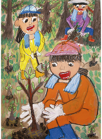 大理さんは夏休みの自由課題として今回の受賞作を制作。タイトルにもなっている「木が元気に育つといいな」という思いを込め、オレンジ色の作業服に身を包んだ自身を中心に、妹や友人と楽しそうに気を植える姿を描いた。