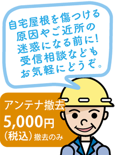 テレビ受信をケーブルなどに切替え後、屋根上にアンテナを放置している家庭に向け市内の業者「アンテナサービス」が注意を呼びかけている。風雨などで倒れると家を痛めたり隣近所へ影響するリスクが高い。「速やかな撤去をお勧めします。お気軽にご相談下さい」と細谷代表。撤去は5千円(税込)で、BSアンテナ移設の場合は見積り。