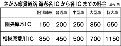 高速道路の利用料金は一般的にIC使用料に相当するターミナルチャージと距離に相当した通行料から算出される。ターミナルチャージは全国一律で150円に設定され1Kmあたりの通行料は普通車で24・6円。しかし海老名IC―相模原愛川IC間は大都市近郊区間に含まれるため、29・52円となる。