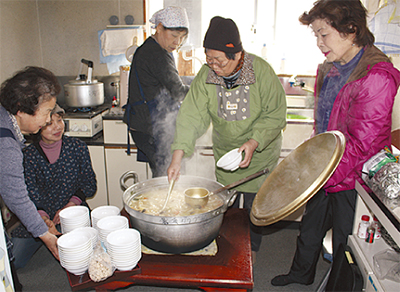 この日会場となった東柏ケ谷4丁目自治会館には70人ほどが集まり、大分県の郷土料理である「だんご汁」が振舞われると、会場は笑顔であふれていた。
