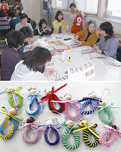 提案はすぐに組合員に受け入れられ、さっそくプロジェクトが始動。その後、市内の各生協の交流会でリボンレイ作りを行い、翌年3月には343個のリボンレイが集まり、被災地である岩手県の「いわて生協けせんセンター」に送った。