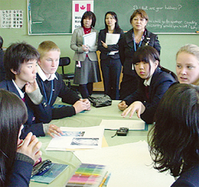 有馬高校(角田一平校長)で11日、被災地を訪れたカナダの高校生が訪問し、同校の外国語コースの1年生と英語で交流が図られた。