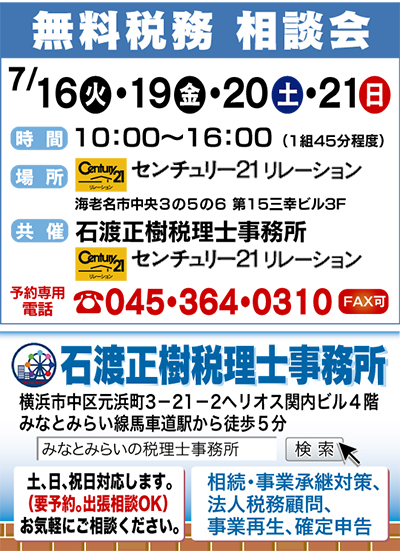 企業や個人商店などの税務をはじめ資産家の相続対策など、会計・税務全般に携わってきた石渡正樹税理士。7月16・19・20・21日(火・金・土・日)の4日間、センチュリー21(株)リレーション(海老名市中央3の5の6・3階)で、無料の「税務相談会」を行う。予約制で1組45分程度(午前10時から午後4時)。会場のリレーションと共催。