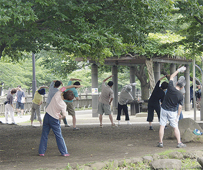 「腕を前から上に―」。夏休みの早朝が思い出されるラジオ体操が20年ほど前から上今泉の北部公園で365日ほぼ毎日行われている。午前6時30分、北部公園には時間とともにどこからともなく多くの人が集まる。