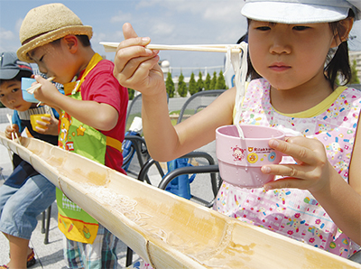 温麺は油を一切使用せず、小麦粉と塩水のみを素材にした麺で、白石では300年近い歴史がある。この麺を使った一風変わったイベントに杉久保小学校に通う同級生らと参加した中山寛太郎くん(6)は、5mほどの竹樋を次々と流れてくる麺をすくい上げ、頬張りながら「おいしい。おいしい」と連呼していた。