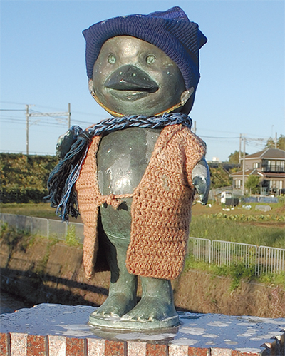 目久尻川に架かる伊勢下村橋の2体の河童像が「衣替え」し、地域に冬の訪れを告げている。