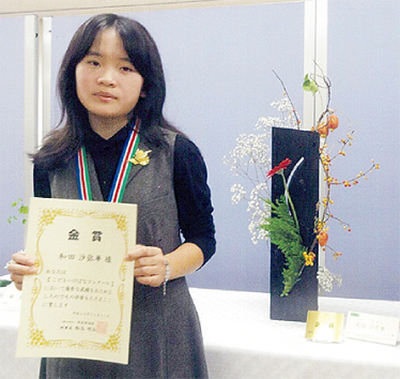 大谷に暮らす和田沙弥華さん(11)がこのほど、「第1回こどもいけばなコンクール」で金賞に選ばれた。